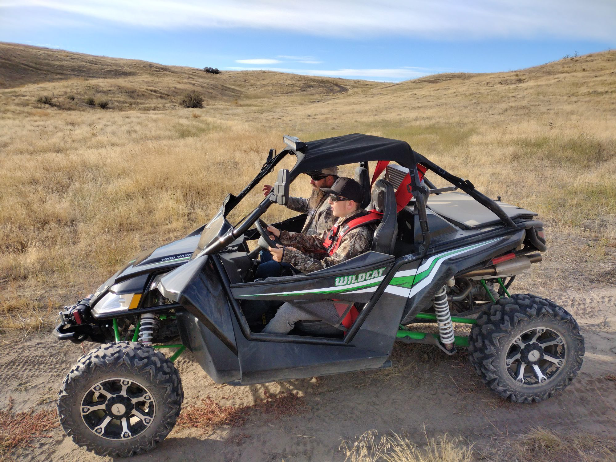 Greg and Jayse went out with Greg’s friend to go deer hunting. He had just got a side by side that they took out with them. They didn’t get any deer but when they were all done. Jayse got to drive the side by side. He had a lot of fun.