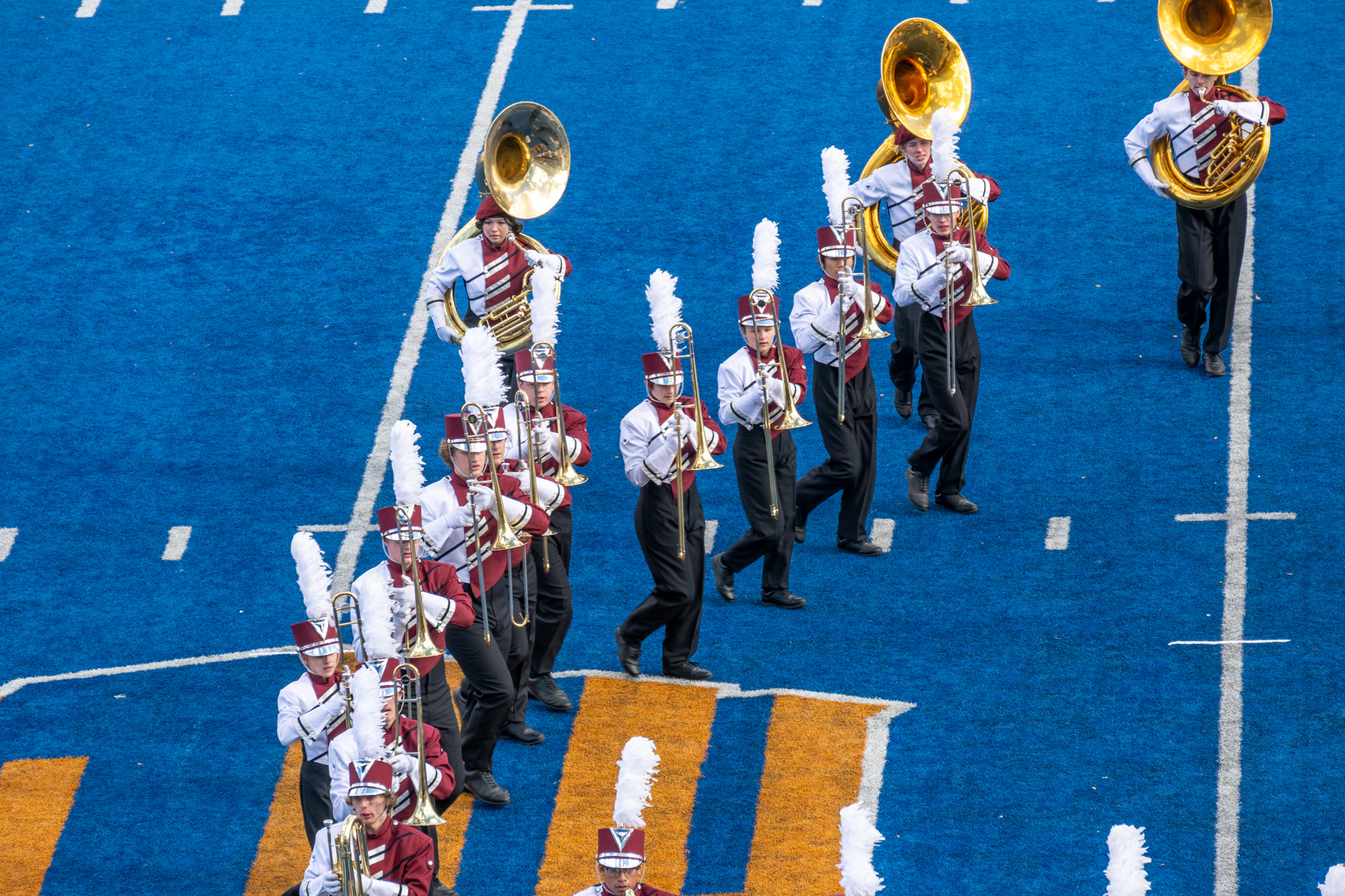 D3 competition is the high of the marching band season. It’s a competition for all the Treasure Valley schools on the Blue Turf at Albertsons Stadium. The Boise State marching band – The Blue Thunder also performs. It’s an all day event. The first band starts at 9 am and it goes until about 11 at night. There were 28 bands that participated. From the small schools to large. The bands performed in their class with the smaller ones going first. Jaelee’s band didn’t perform until the afternoon. At the competition they announce the size of each band and Greg kept track in our program. We found out Centennial’s band was the largest with 108 members!