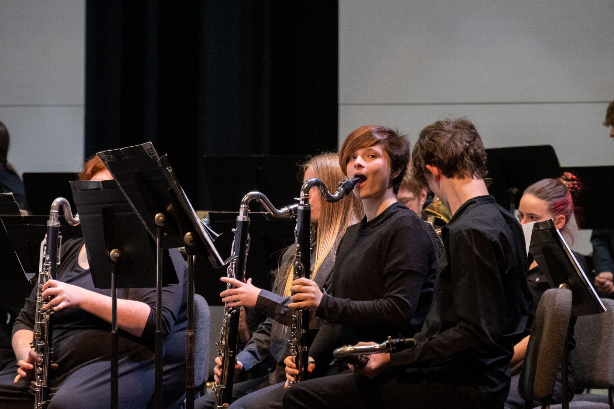 The concert blew my socks off! First the jazz bands performed. There are 2. One for the freshman and one for the upper classman. They both were great. I saw a lot of kids I recognized from marching band and the craziest thing was almost all of them were playing different instruments. I just continue to be blown away by the talent of all the kids – including Jaelee. She played trombone in marching band but plays bass clarinet in concert band.