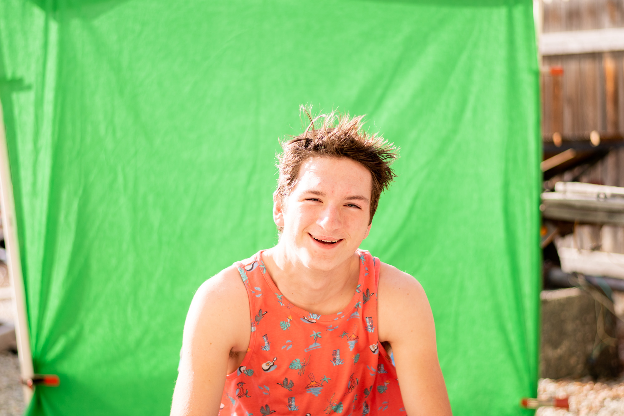 To get a picture of us on a roller coaster I needed us to post as if we were on one. I put my green screen up outside with a char and a big fan to blow our hair. It was only 50 degrees out but I wanted it to look like summer, I lucked out that the sun was out. So we all put on t-shirts and each sat in the chair while I got pictures with the wind blowing on us. It was COLD with that fan right in our face so it was a rapid fire of pictures for each and then were were done.