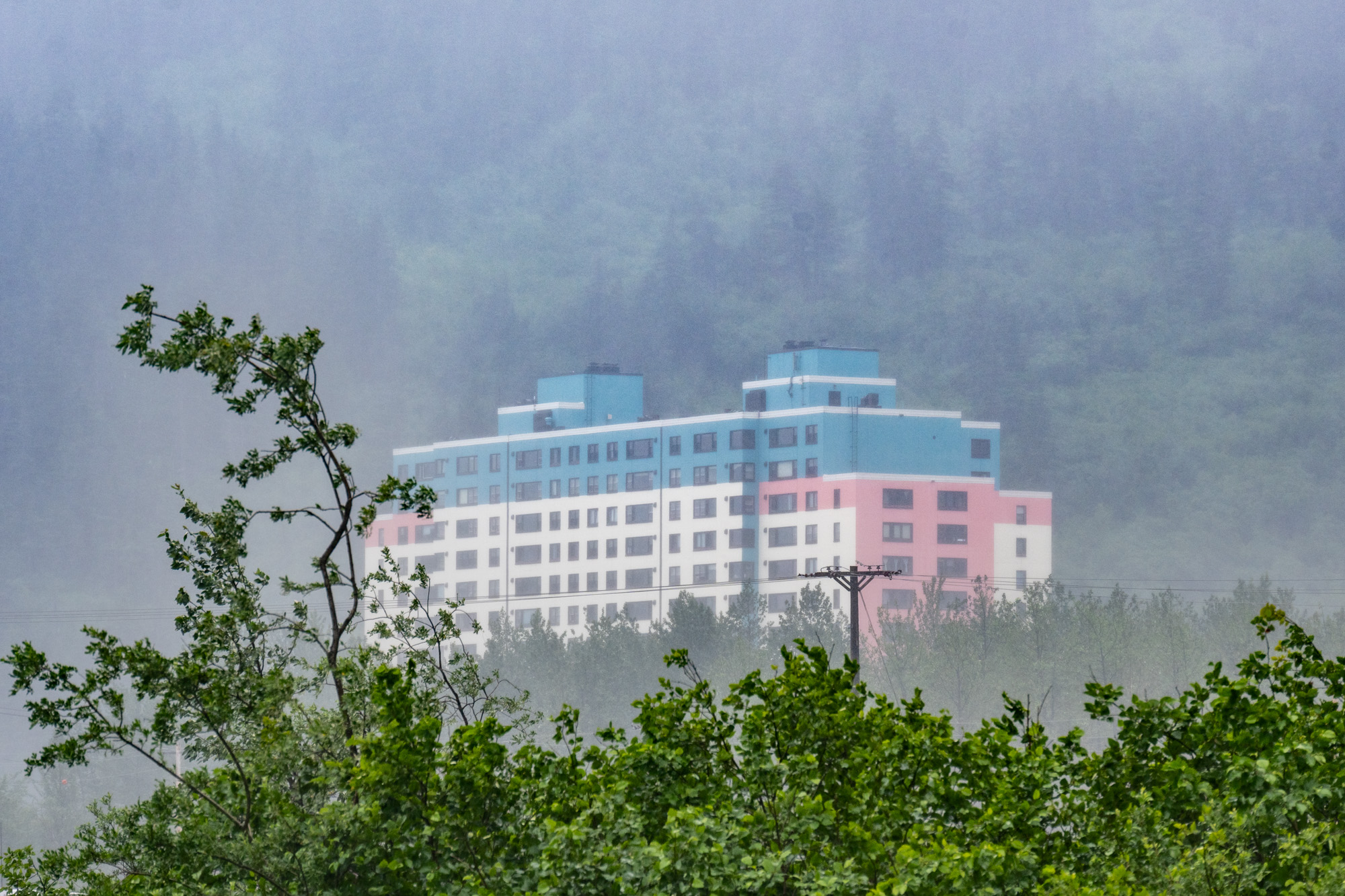 As we drove through town, he gave us a mini-tour. We learned that 80% of Whittier’s population lives in one building—a large apartment complex, which turned out to be where our suite was located, on the 14th floor. When we arrived at the building, I fell out of the van and completely demolished the driver’s step stool, making me even more soaked! Finally, we got to our room, and I couldn’t have been more grateful to change into dry clothes.