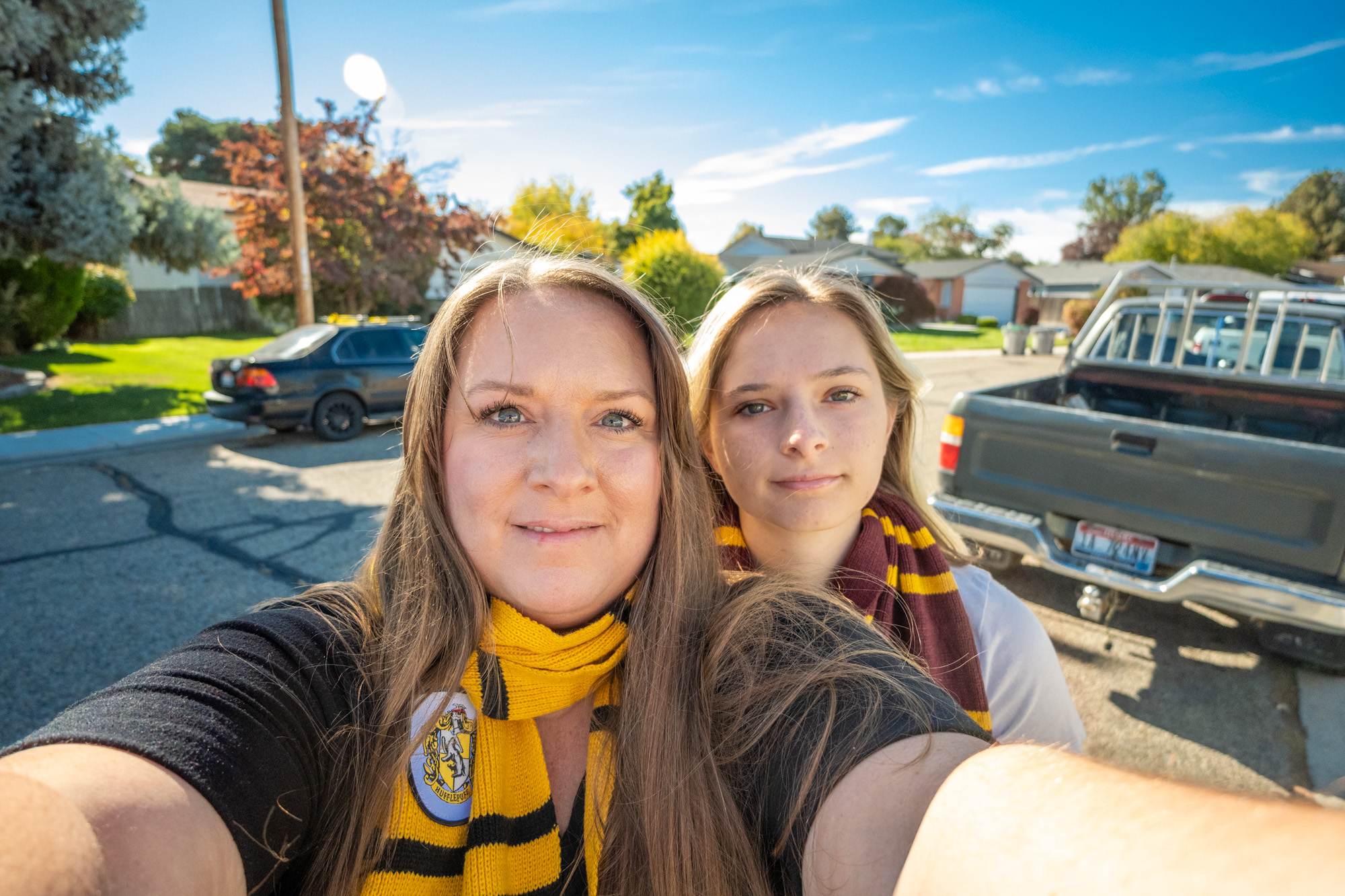 I wanted to create a Harry Potter themed card – going with the flying car idea. I bought us some scarfs from each of the houses. They didn’t show up as well as I wanted in the car, so later Jaelee helped me photograph the scarfs so I could add them into the image later. I purchased an image of a train, the same one from Harry Potter to use as the background. I used AI to create the owl. It was fun making.