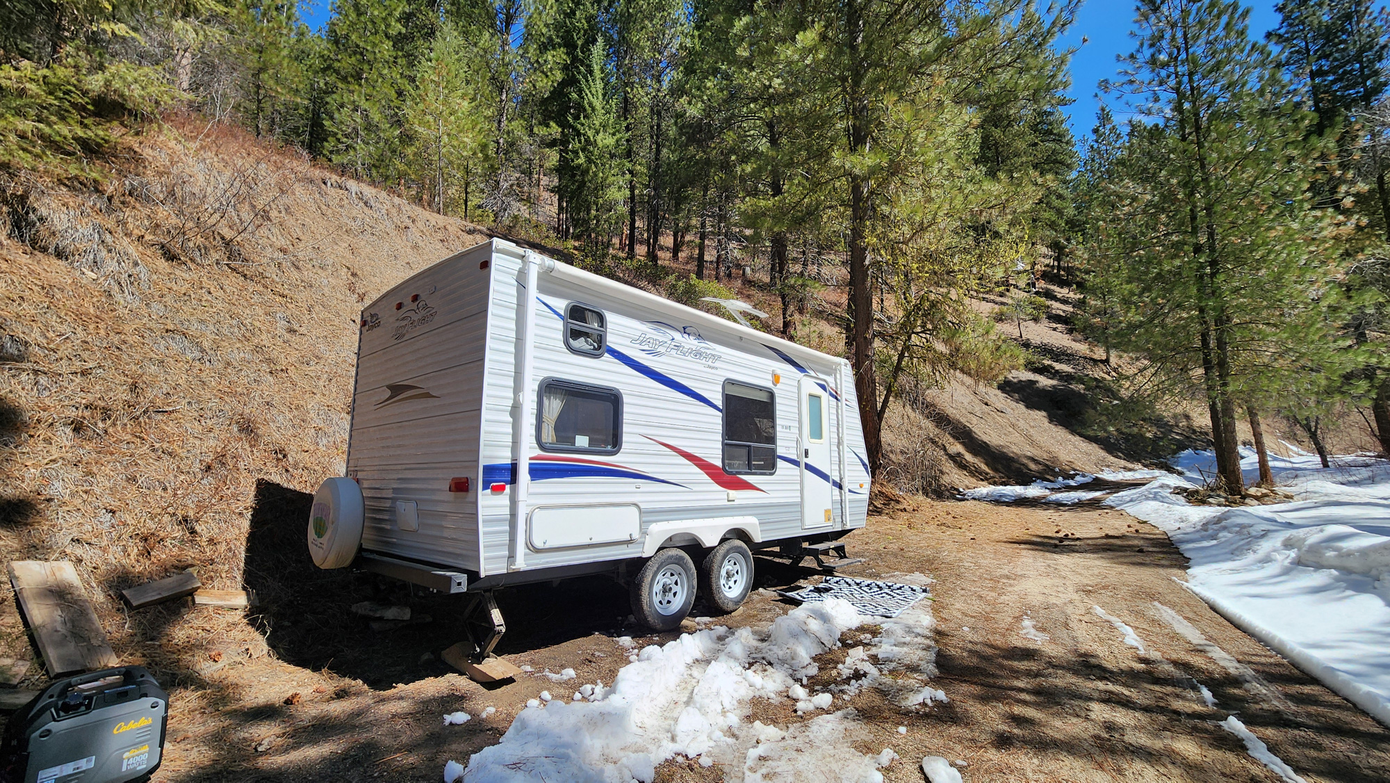 Even though there was still snow on our property Greg was determined to get our trailer out there so we could stay there. There was a section off the road it would fit. So we went to his shop and got the trailer ready. While Greg was doing an oil change on his truck Jaelee and I went and got the trailer. She drove the little truck, we hooked it up and drove it closer to his shop.