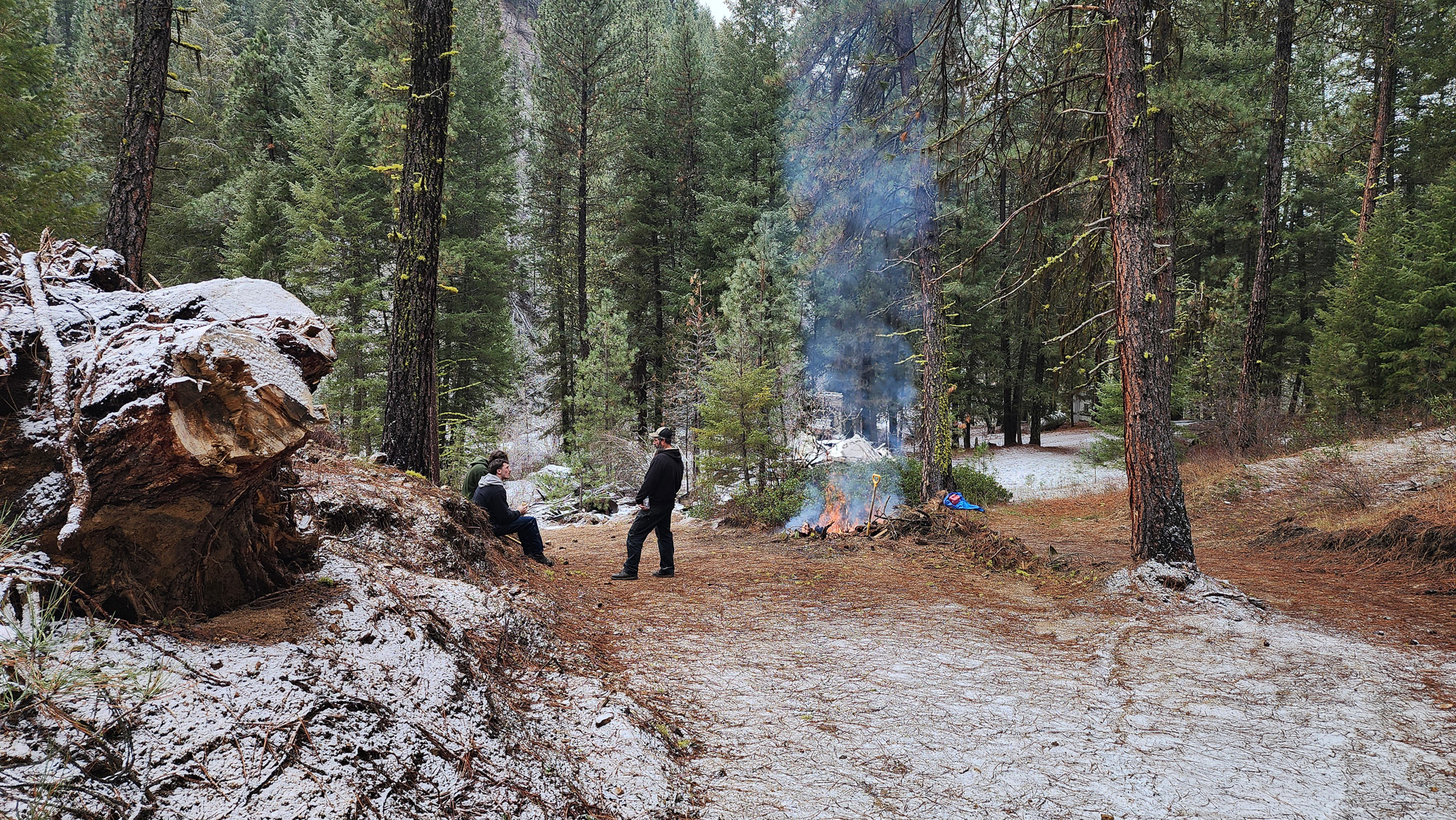 It had been weeks so Greg had to get out to our property. It had snowed just a bit so he thought it would be a good time to burn another slash pile. So Greg, Jayse Ashton and I went out there. The guys went out there earlier and when I showed up they went hiking to check cameras while I maintained the fire. When they made it back I stayed for a little bit longer and then Ashton and I left. Greg and Jayse stayed to finish the fire and came back later.