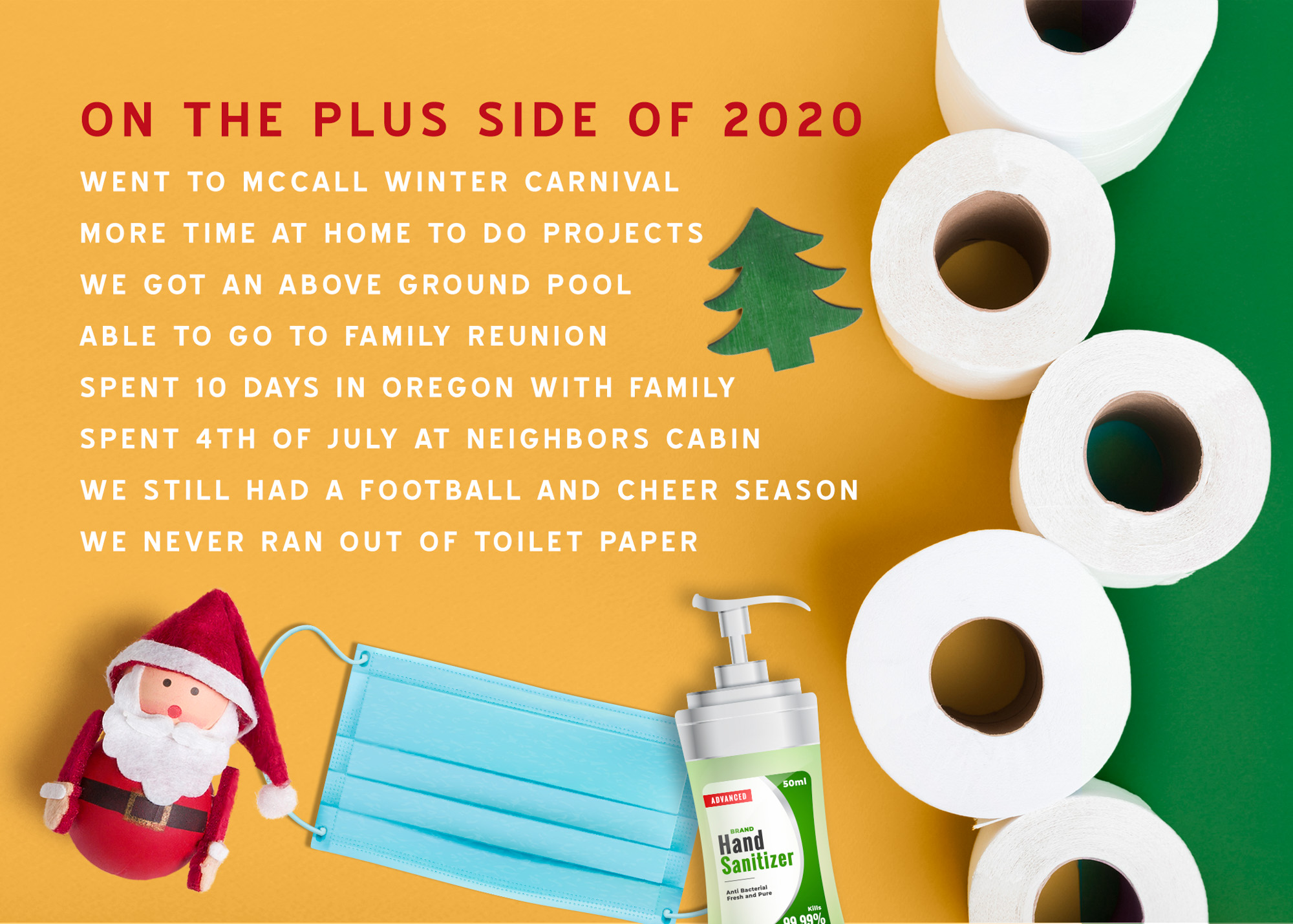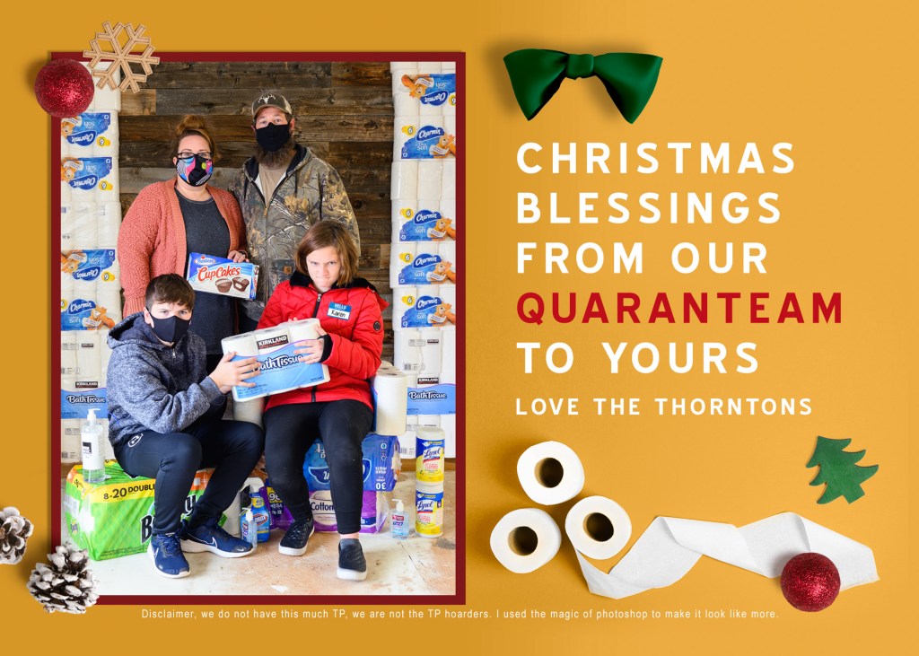 What a crazy year 2020 was. The great toilet paper hoard and shortage. I knew I wanted to do something with TP. We had a busy month and Greg was hunting a lot so I had to put something together last minute. We were in the middle of redoing our floor, I set up a scene really quick and took a few photos. And walla that was our card for the year.