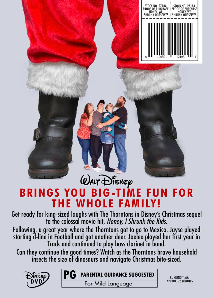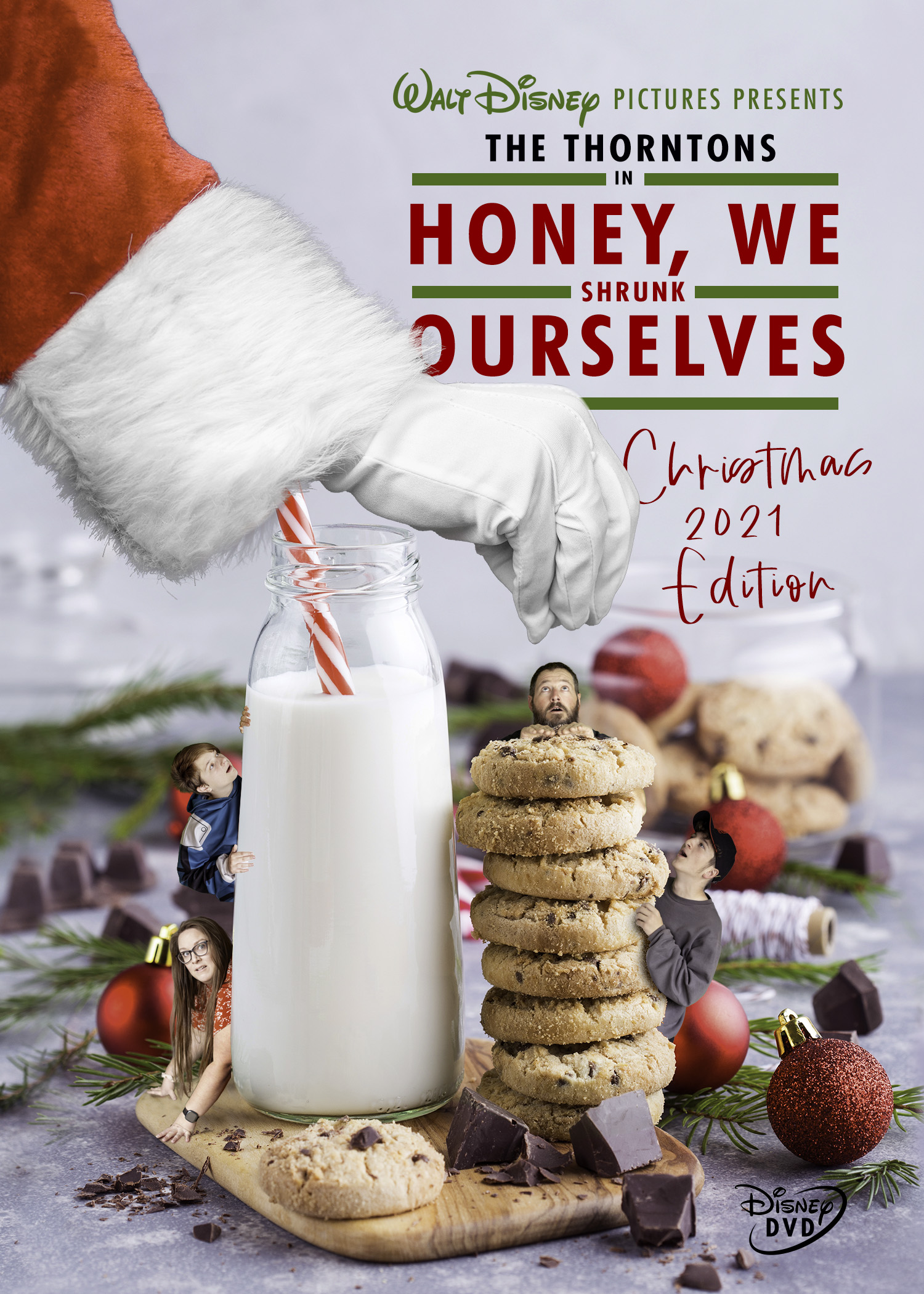 I wanted us to be shrunk with Santa Claus being normal size. It turned out just as I wanted. I took our pictures with a green screen background and then photoshopped us into the cookie picture. I was able to find some Santa art on stock sites and over layed his pieces on top of all that. I didn’t plan for it to look like a DVD cover but as I started to put it together it just started to look like one so I went with it.