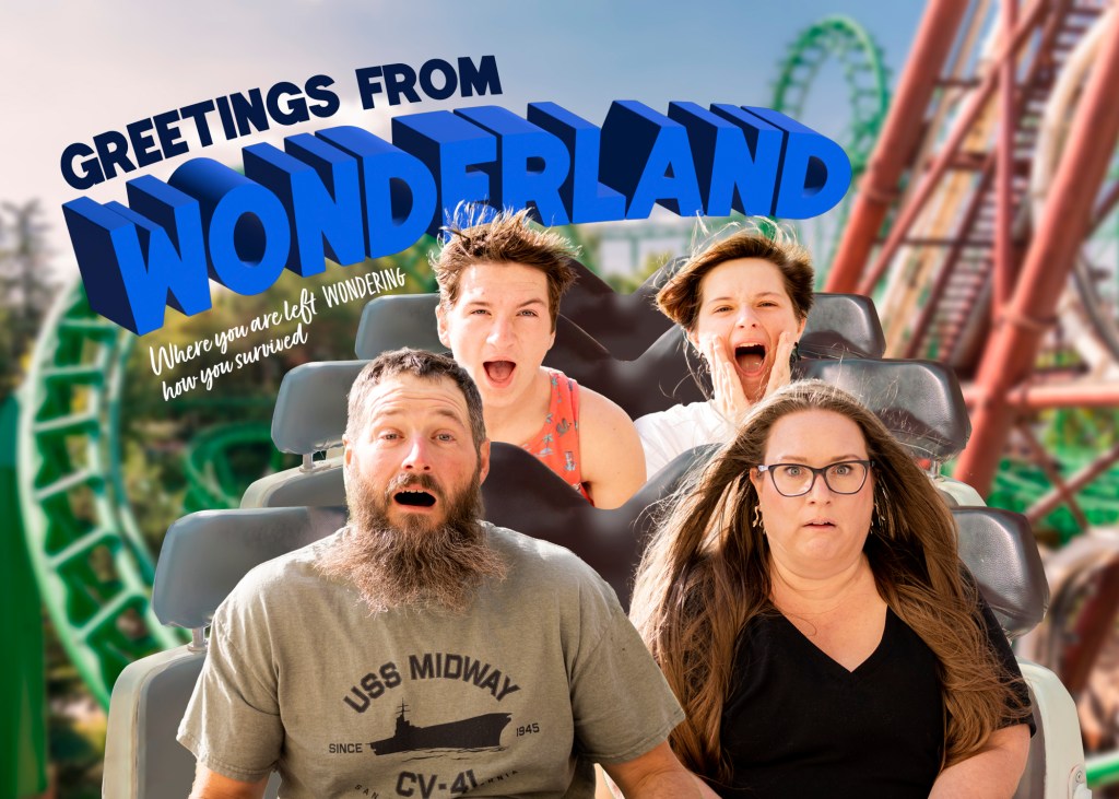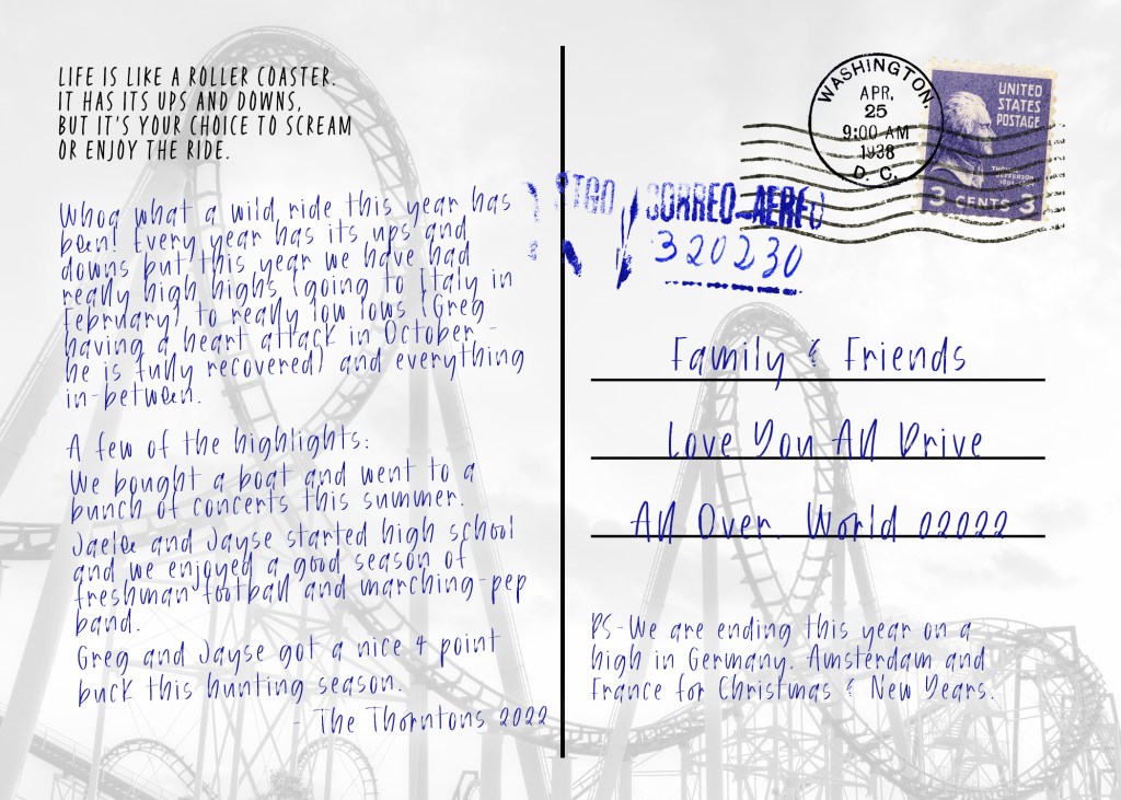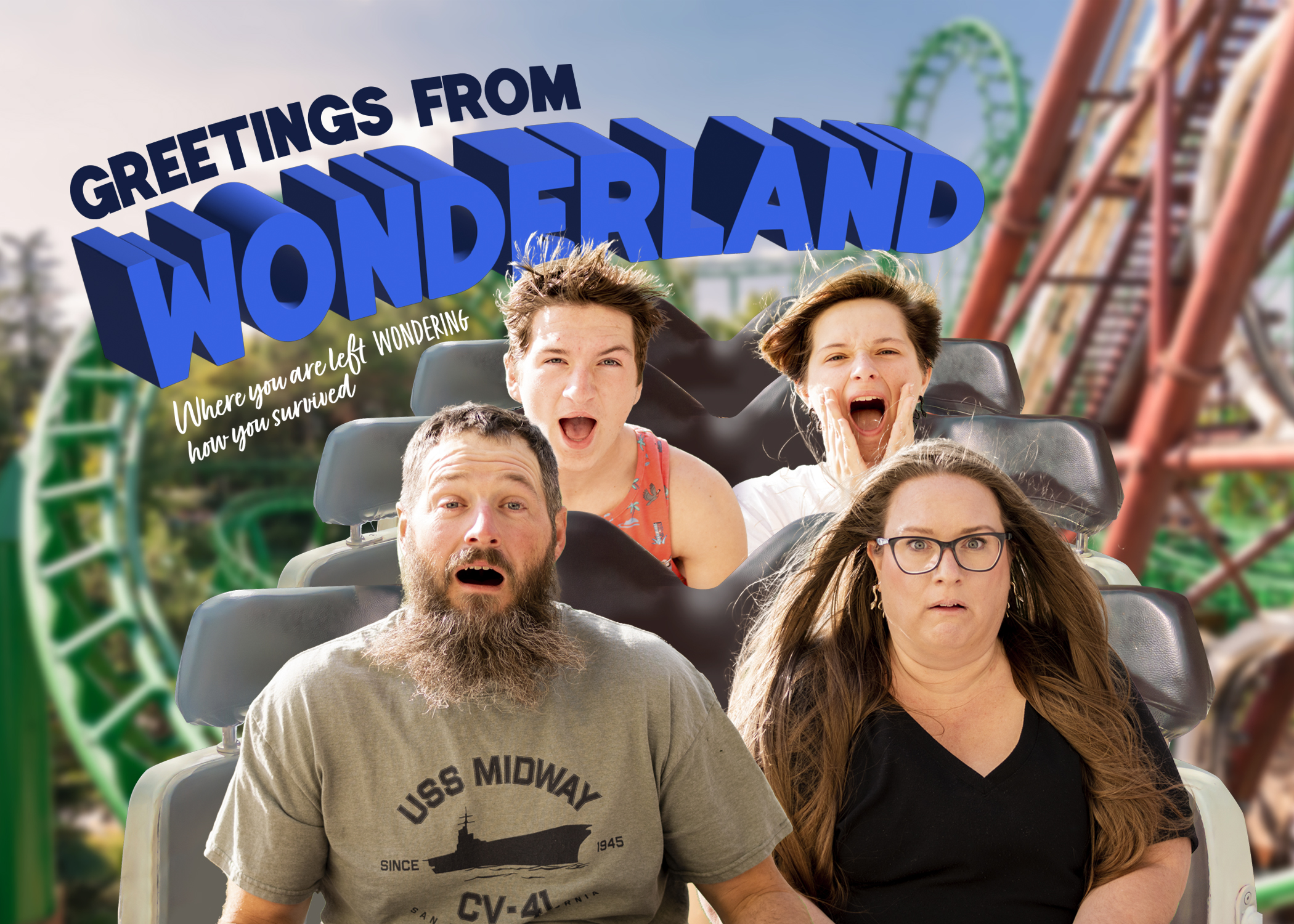I wanted the card to look like a card you’d send someone from a theme park. I had us go outside and each sit in a chair I’d set up in front of my green screen with a fan blowing on us to make it look like we were really on a roller coaster. It was cold outside. I think about 50 degrees so it was freezing sitting in front of that fan. Everyone was a good sport and I got some images I could put together to put us in a roller coaster. I got a seat and roller coaster image from stock and put it all together.