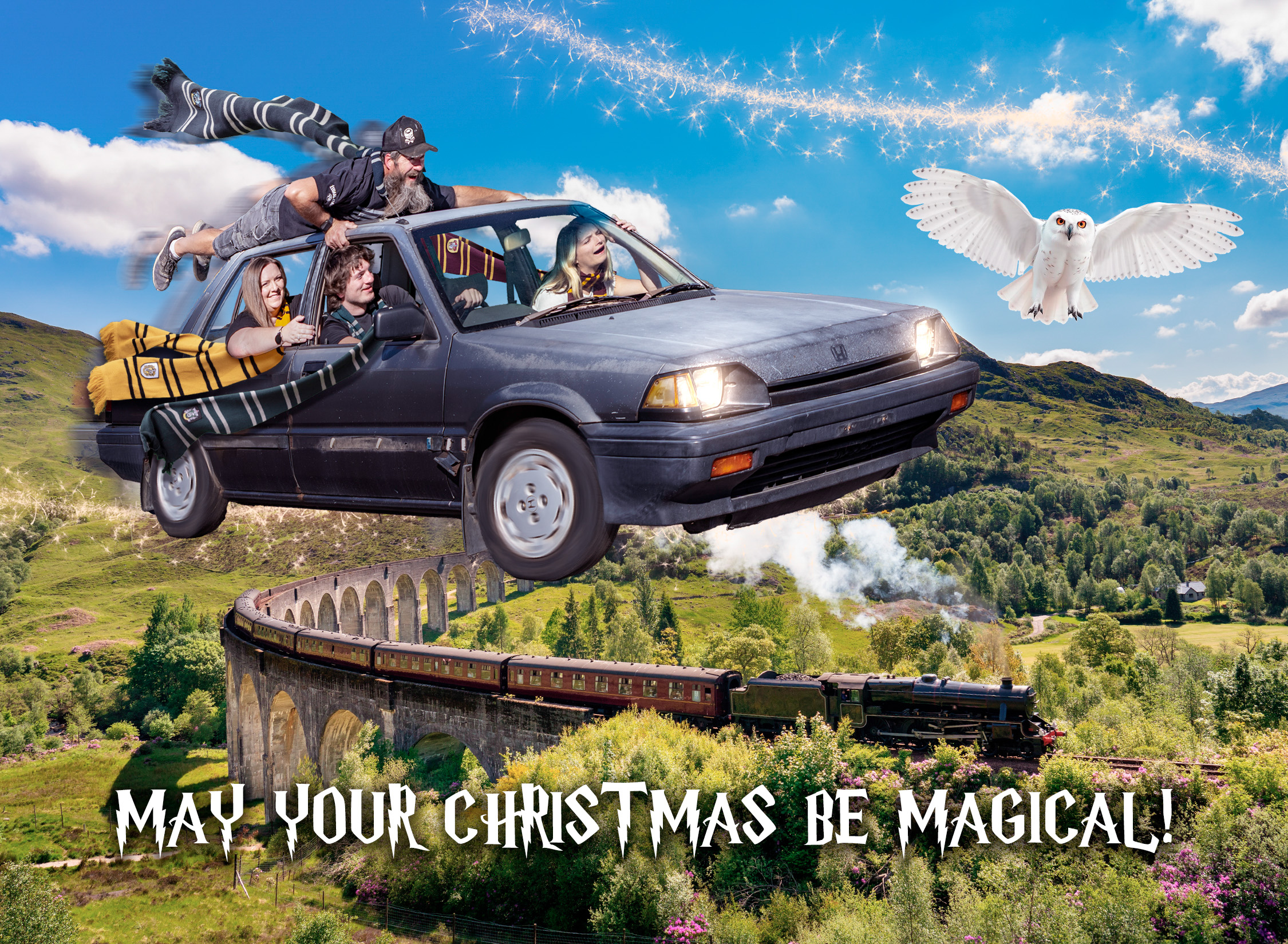 I knew when the kids got their licenses I wanted to do something with them driving for our card. As I started to come up with ideas a flying car came to mind and then that brought ideas of Harry Potter (which we all love). One of my favorite parts is when Ron & Harry drive the car to Hogwarts. So that’s what I set out to recreate. Jayse had just bought his own car so I thought we could use it. I bought us some house scarves. You can see more of the making of this card here.